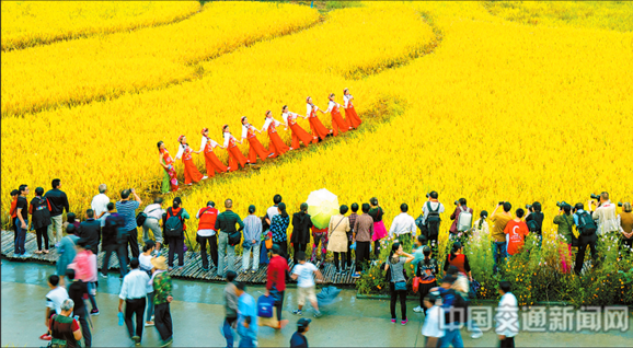 图为参赛作品《山乡脱贫有新路》——安徽省石台县库山村“四好农村路”旁举行的丰收节表演吸引外地游客。 汪志国 摄