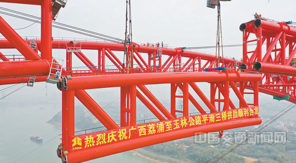 1月10日,随着最后一处拱肋连接点顺利完成焊接,由广西交通投资集团投资、广西路桥集团承建的“世界第一拱”平南三桥主拱肋实现高精度合龙。合龙口弦管对接误差小于3毫米,拱轴线横向偏位小于10毫米。