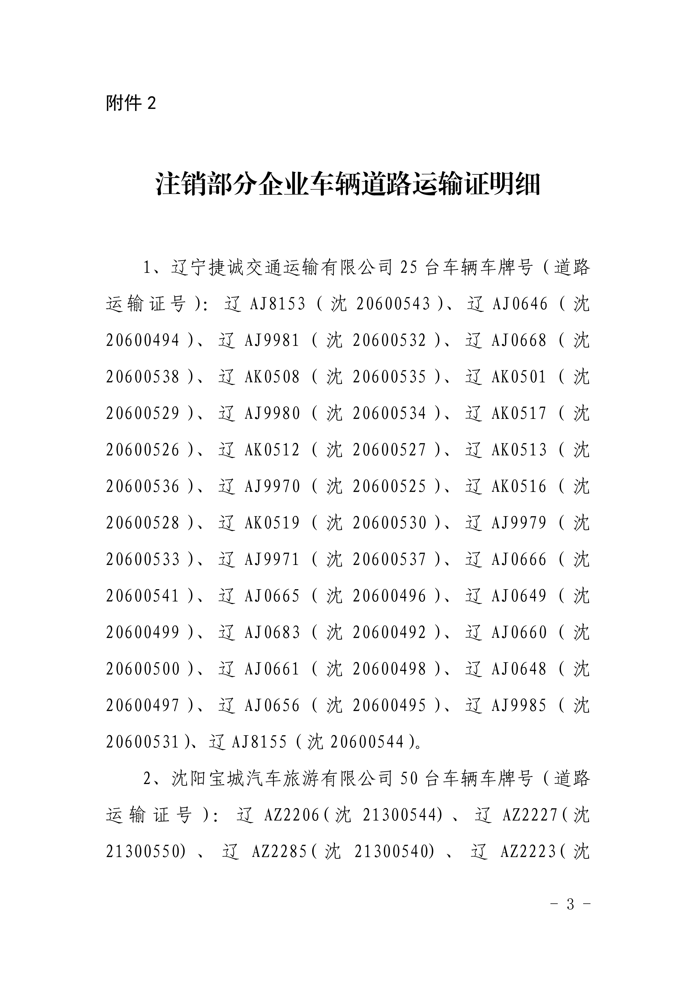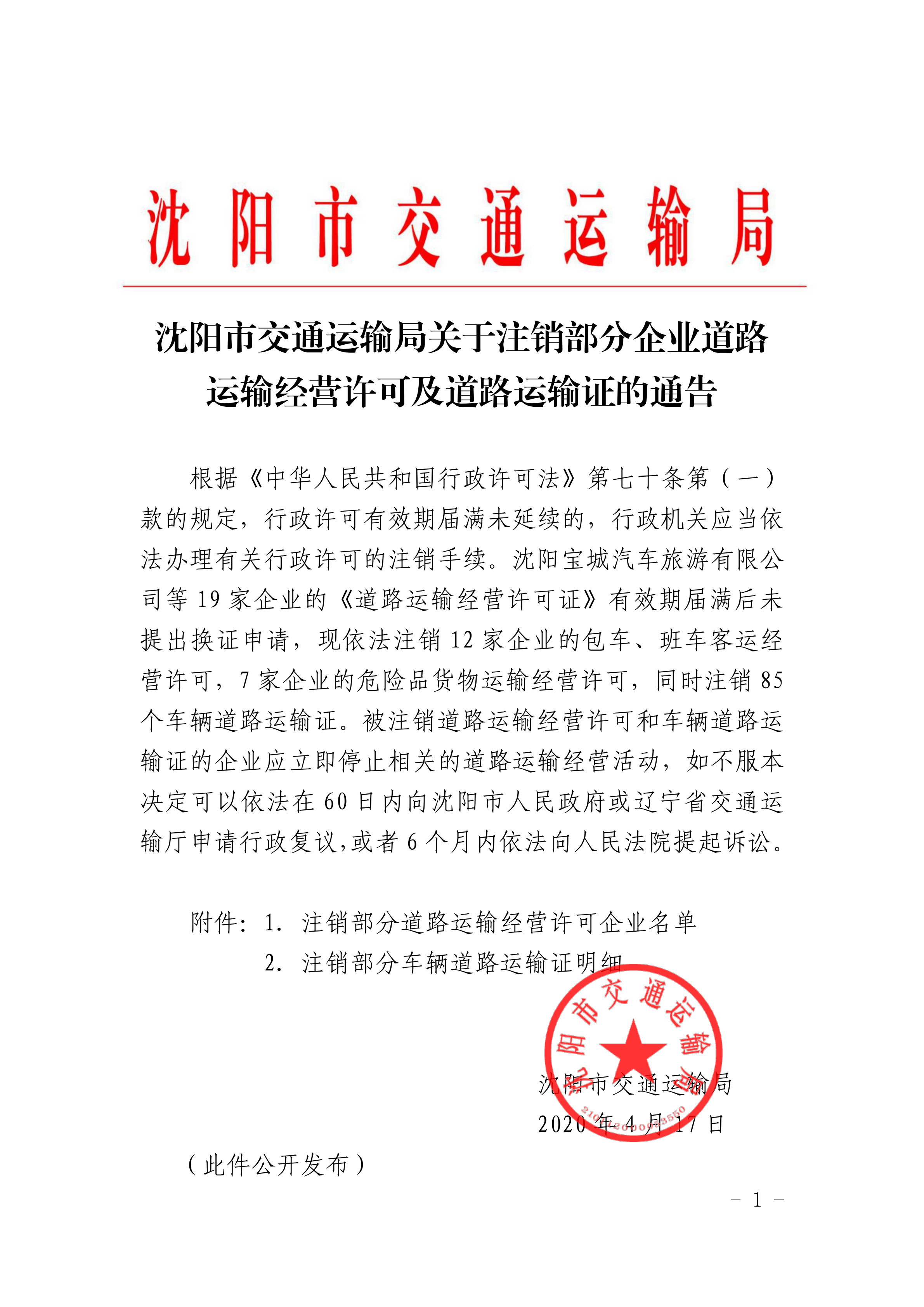 沈阳市交通运输局关于注销部分企业道路运输经营许可及道路运输证的通告